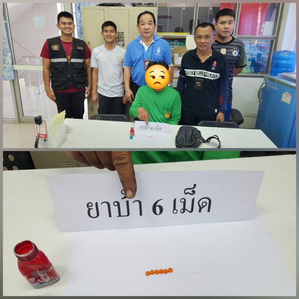🔓ของกลาง ยาบ้า จำนวน 6 เม็ด อยู่ในขวดพลาสติกสีแดงซุกซ่อนอยู่ในกระเป๋าสะพายของผู้ต้องหา