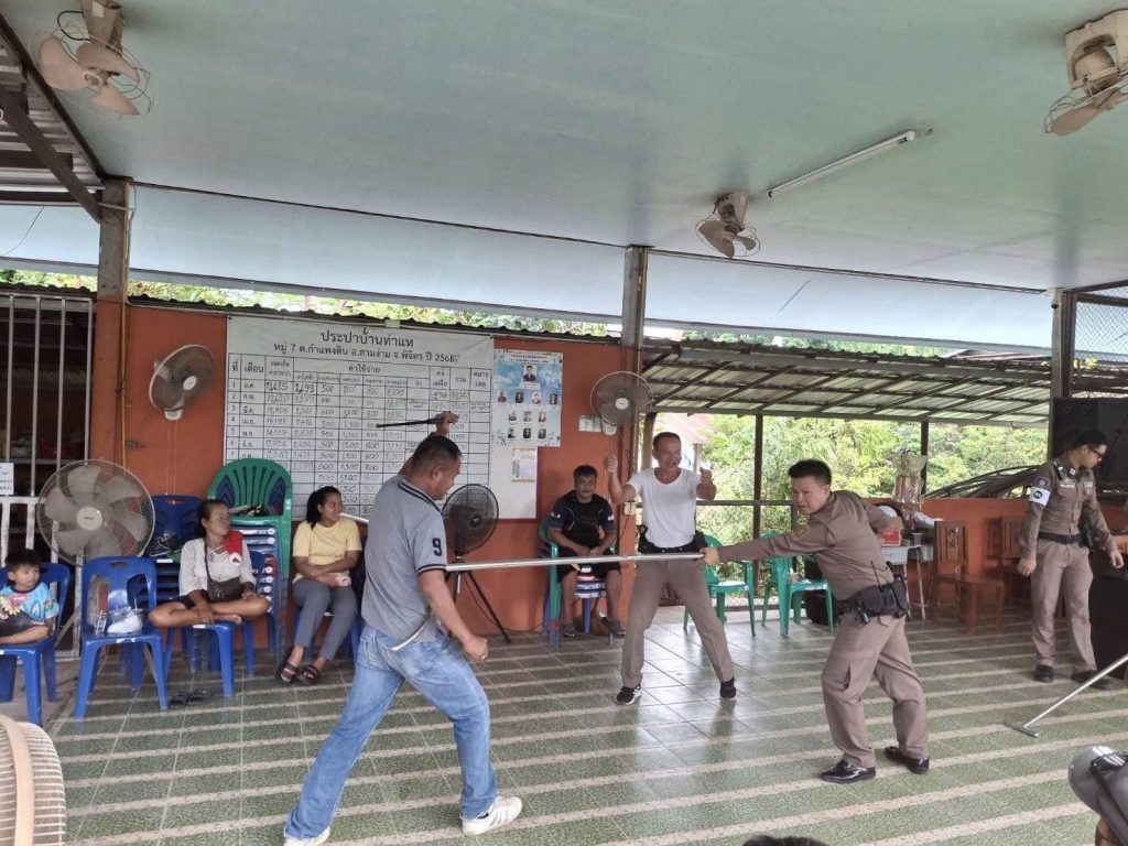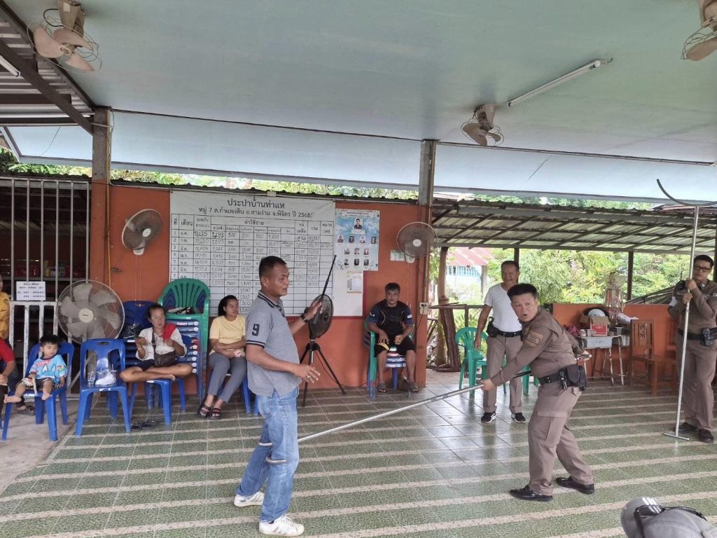 สภ.สามง่ามให้ความรู้ พร้อมทั้งฝึกการใช้ไม้ง่ามในการควบคุมบุคคลคุ้มคลั่ง บ้านท่าแห หมู่ที่ 7 ตำบล กําแพงดินฯ