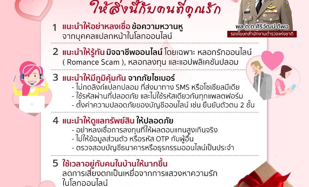 สำนักงานตำรวจแห่งชาติ จึงขอใช้โอกาสนี้ แนะนำพี่น้องประชาชน ที่ไม่ต้องการเจ็บปวดใจให้กับความรักที่ไม่สมหวัง ให้หันมาแสดงความรักกับคนในครอบครัว ด้วยการสร้างภูมิคุ้มกันภัยอาชญากรรมทางเทคโนโลยี ซึ่งเป็นภัยคุกคามสำคัญที่สร้างความเสียหายให้กับพี่น้องประขาชนจำนวนมาก โดย สำนักงานตำรวจแห่งชาติ ขอแนะนำ ดังนี้
